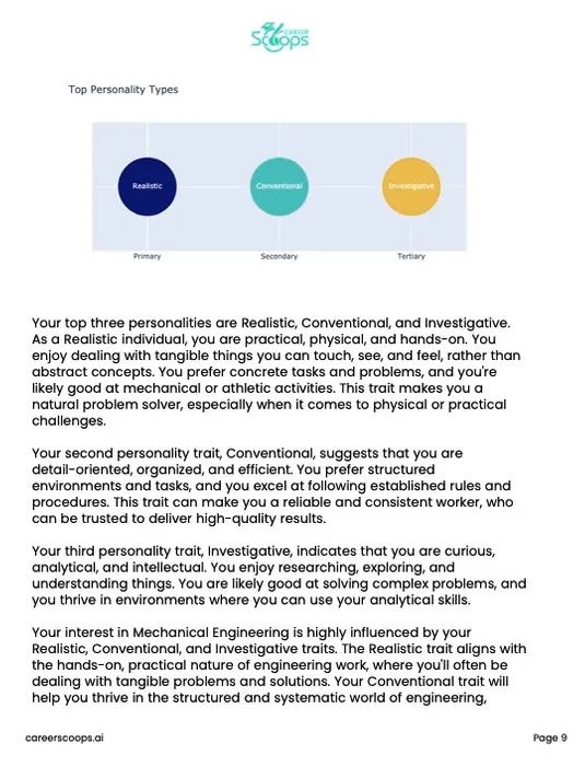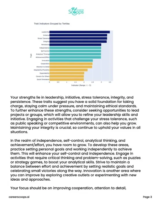 Free quizzes give you a personality type or a vague job cluster. Career Scoops gives you 20+ pages of specific, data-backed career intelligence - including income projections, education requirements, lifestyle expectations, and the skills your teen should be building right now. There's simply nothing else like it. This detailed report is crafted to provide a rich, personalized career guidance experience tailored to the unique contours of each person's profile.